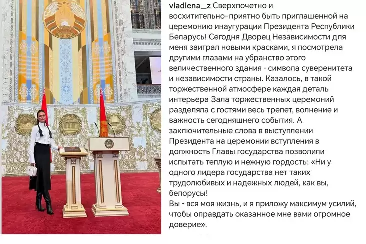Судя по социальным сетям Зайцевой, она довольно часто сопровождает Лукашенко в поездках — даже если не попадает в объективы государственных СМИ. Так, осенью 2022 года Владлена, похоже, была рядом с политиком во время его первого официального визита в Абхазию.