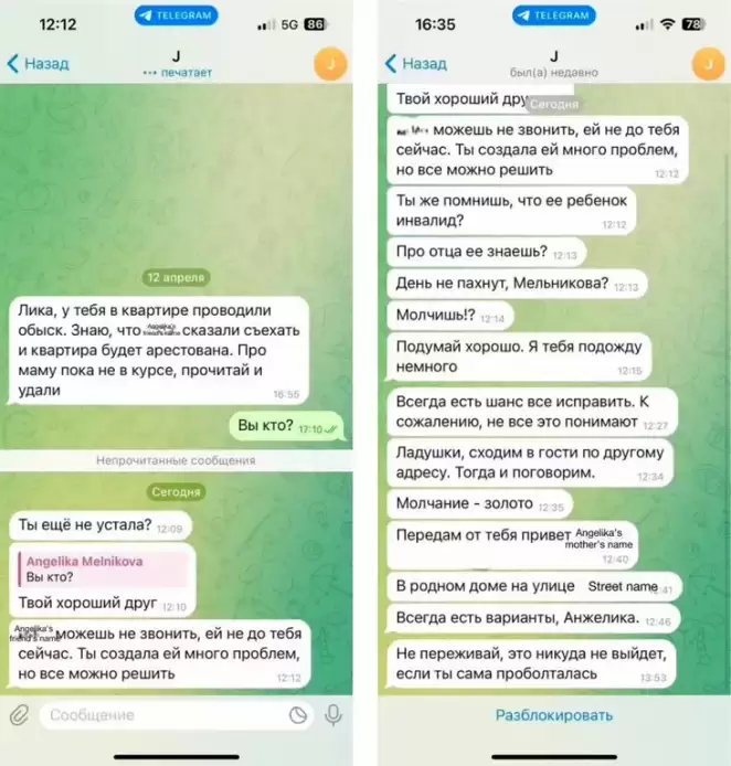 В переписке к Анжелике обращаются «Лика». «Вы кто?» — спрашивает она. «Твой хороший друг», — отвечает анонимный собеседник, после чего следует череда угроз. Он упоминает об обыске и косвенно призывает ее покаяться, пойти на сотрудничество. Он также упоминает одну из подруг Мельниковой по имени, якобы для шантажа: «Ты же помнишь, что ее ребенок — инвалид, да? […] Ты создала ей много проблем, но все можно решить».