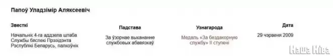 Владимир Попов получал медали как сотрудник штаба Службы безопасности Лукашенко. Скриншот с pravo.by