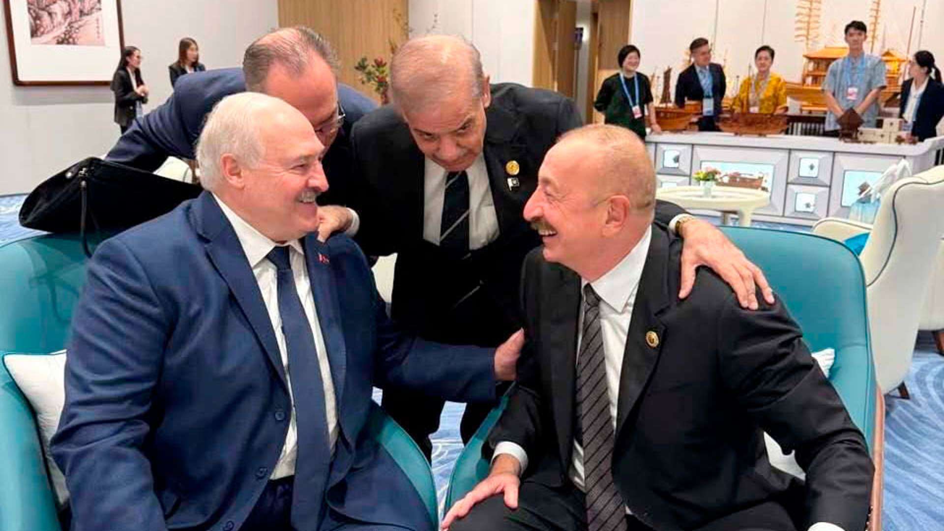 А вот встреча Алиева с главным союзником России - Александром Лукашенко прошла совсем в другой атмосфере. На опубликованном телеграм-каналом «Пул Первого» лидеры Беларуси и Азербайджана сидят в придвинутых друг к другу креслах президенты что-то живо обсуждают и смеются, при этом Лукашенко по-дружески держит Алиева за предплечье.