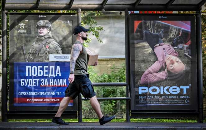 Мужчина проходит мимо плаката, который рекламирует службу в армии по контракту в центре Москвы. Россия. 11 сентября 2025 года. Фото: Alexander Nemenov / AFP / East News