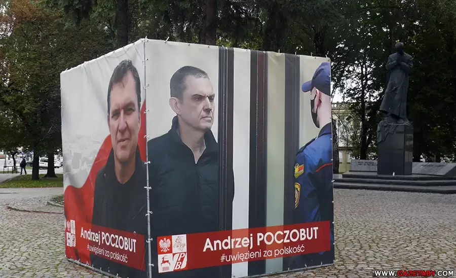 Стенд с фото Анджея Почобута в Белостоке установлен рядом с памятником ксендзу Ежи Попелушко, активному стороннику «Солидарности», убитому сотрудниками Службы безопасности МВД Польской Народной Республики