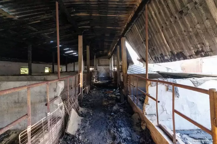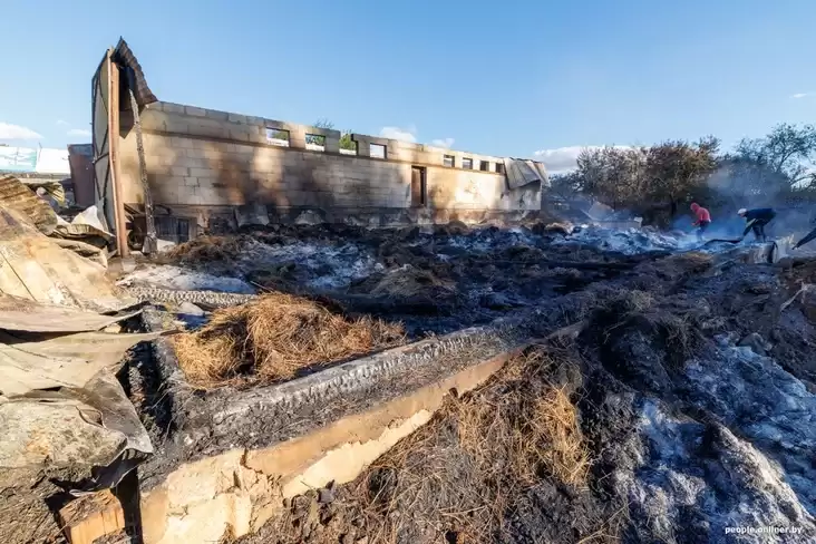 Татьяна рассказывает, что только на четвертые сутки им разрешили вывезти останки погибших животных и разбирать то, что осталось от некогда большого хозяйства. Сейчас вокруг остатки тлеющей крыши и сена. Но самое страшное — внутри сарая: повсюду лежат обугленные тела животных.