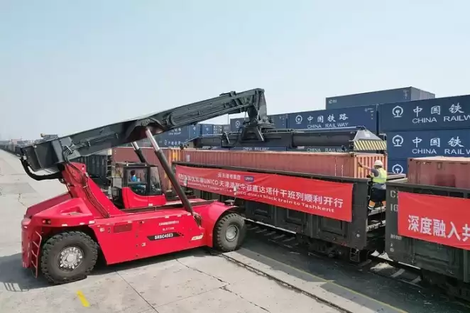 Поезд «Китай — Центральная Азия» с 50 контейнерами автодеталей, оборудования, строительных материалов и бытовой техники отправляется из порта Тяньцзинь в Ташкент. 20 мая 2024 года. Фото: Tong Yu / China News Service / VCG via Getty Images