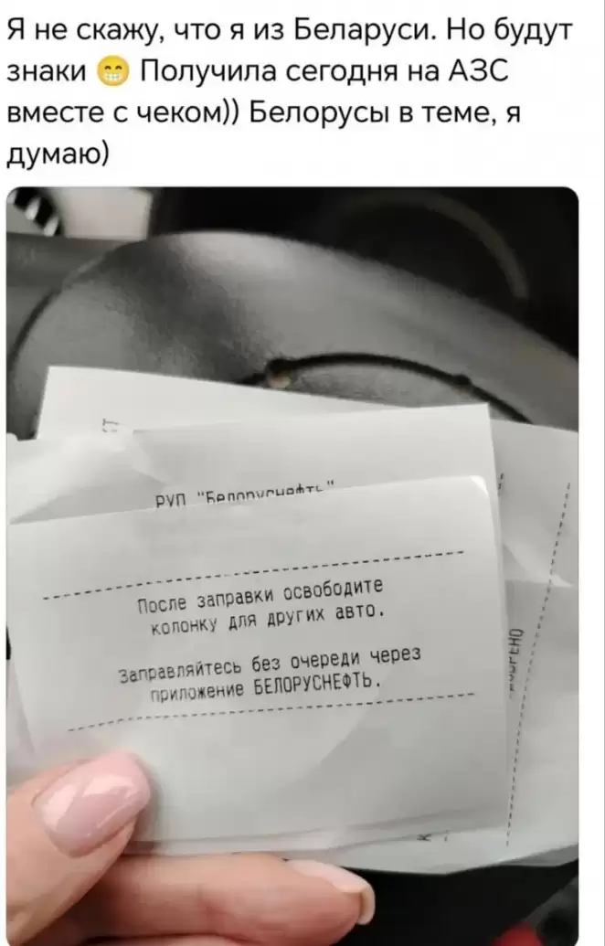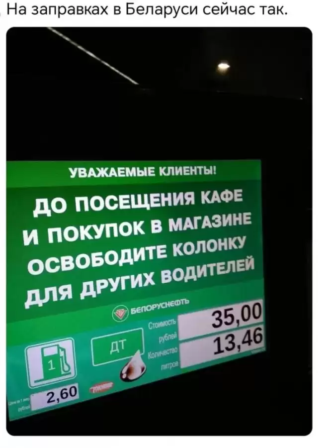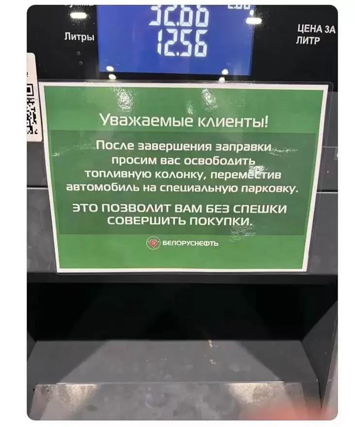 Один из пользователей Тредс выложил фотографию с заправки «Белоруснефти». Там оперативно повесили напоминание: «После завершения заправки просим вас освободить топливную колонку, переместив автомобиль на специальную парковку. Это позволит вам без спешки совершить покупки».