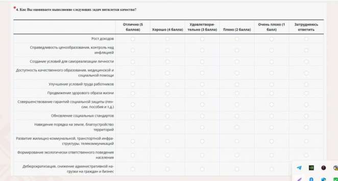 Участников опроса просят оценить выполнение задач «Пятилетки качества» (доходы, инфляцию, благоустройство, медицину и прочее) и «Года благоустройства», определить направления регулирования экономики и стимулирования занятости, которые поддерживает респондент. Также предлагается выбрать задачи учреждений образования, пути развития системы здравоохранения, принципы миграционной политики и то, как побудить молодежь жить и работать в Беларуси.