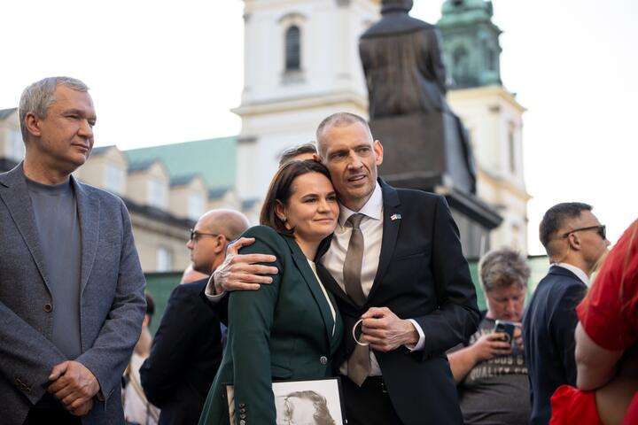 Павел Латушко, Светлана и Сергей Тихановские на встрече с беларусами Варшавы в окружении охраны. Польша, 26 июля 2025 года. Фото: пресс-служба Светланы Тихановской
