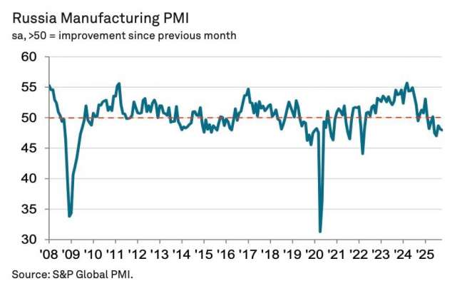 По данным S&P Global, падение деловой активности в РФ стало самым резким с июля, а объемы производства снижаются восьмой месяц подряд. Сокращение новых заказов — самое сильное за последние три месяца, что говорит о затухающем внутреннем спросе и замедлении даже военного производства, которое долгое время подпитывало российскую экономику.