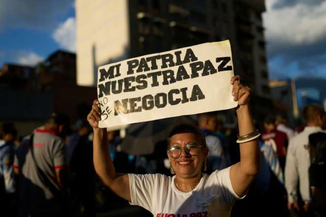 Женщина держит плакат с надписью «Моя Родина, наш мир не подлежит обсуждению» на организованном правительством митинге против иностранного вмешательства в Каракасе, Венесуэла. 30 октября 2025 года. Фото: Ariana Cubillos / AP Photo / East News