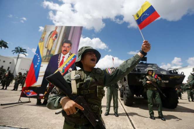 Бойцы Боливарианских вооруженных сил выкрикивают лозунги во время военных учений в Каракасе, Венесуэла. Президент США Дональд Трамп угрожал Венесуэле «непредсказуемыми» последствиями, если она откажется принять обратно мигрантов, которых она «вынуждала въехать в Соединенные Штаты». 20 сентября 2025 года. Фото: Pedro Mattey / AFP / East News