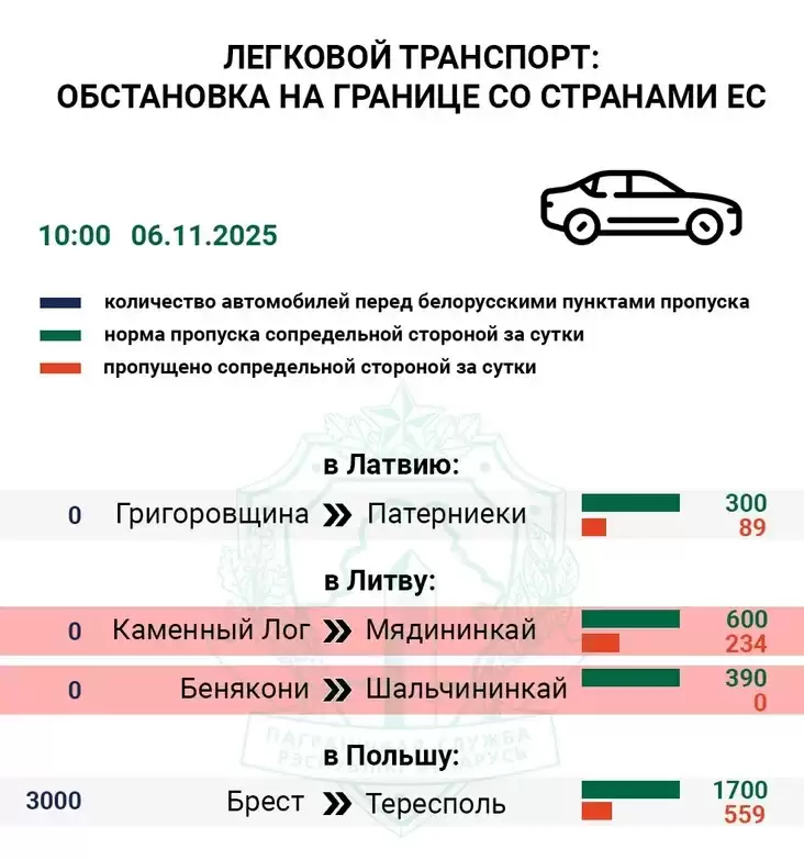 На границе с Латвией — «Григоровщина — Патерниеки». При этом попасть в Латвию непросто: автомобили на белорусских номерах туда давно не пускают, а еще белорусам не позднее чем за 48 часов до пересечения границы нужно заполнить специальную анкету. Вернуться из Европы через Латвию еще сложнее, так как там с 15 октября действует электронная очередь. По состоянию на 6 ноября ближайший слот есть только на 18 ноября.