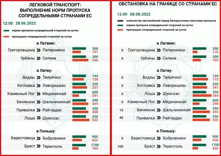 По состоянию на 12:00 28 июня 2022 года из Беларуси в ЕС выехало 3811 легковых авто, а 8 августа 2022 года — 3509 авто. Фото: телеграм-канал Пограничного комитета Беларуси