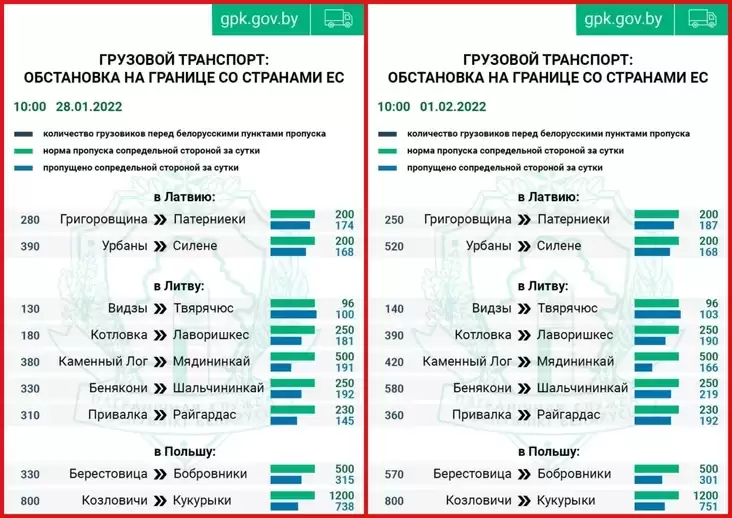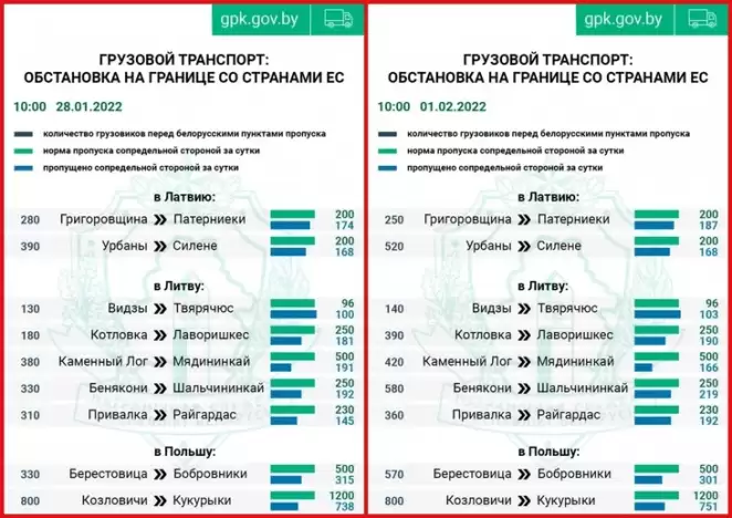 Тогда за сутки из Беларуси в Евросоюз выехали 2204 грузовика, а 1 февраля 2022 года — 2277 грузовиков.