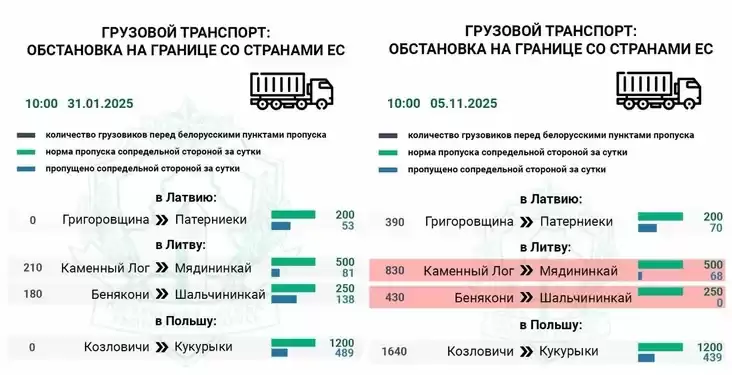По состоянию на 12:00 31 января 2022 года из Беларуси в Латвию выехало 53 грузовика, а 5 октября 2025 года — 70. Фото: телеграм-канал Пограничного комитета Беларуси