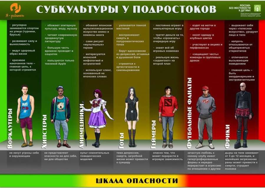 В ней используется российская инфографика про молодежные субкультуры, самыми опасными среди которых названы футбольные фанаты и фрики. Также даются «основные рекомендации по профилактике включения в деструктивные субкультуры».
