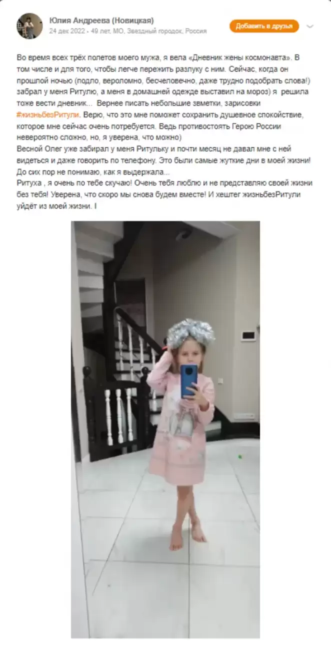 А уже в декабре 2022 года женщина выложила в инстаграм видео с просьбой защитить её от героя (Новицкий имеет звание Героя России) — тогда она призналась, что находится в процессе развода с космонавтом.