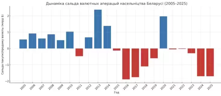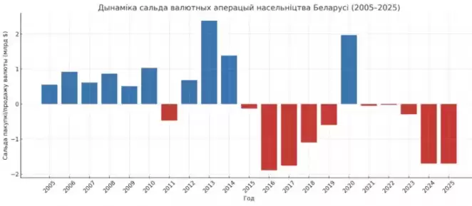 График «Нашай Нівы», показывающий сальдо валютных операций населения за последние 20 лет. Данные за 2025 год прогнозные, они выстраиваются на основе данных за девять месяцев года