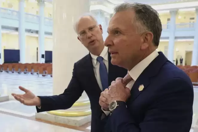 Кирилл Дмитриев и специальный посланник президента США Дональда Трампа Стив Уиткофф. Санкт-Петербург. 11 апреля 2025 года. Фото: Vyacheslav Prokofyev, Sputnik, Kremlin Pool Photo via AP