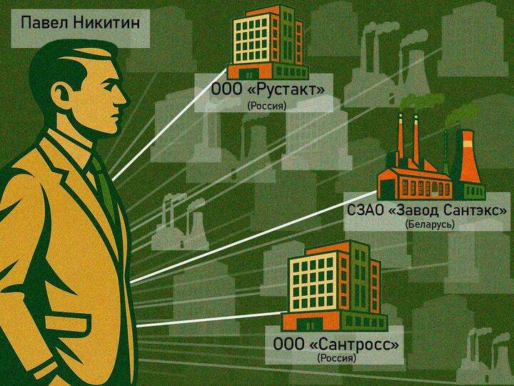Ключевым звеном в этой цепи является общий собственник «Завода Сантэкс» и двух его российских партнеров ООО «Сантросс» и ООО «Рустакт» — Павел Никитин. Бизнесмен родился в Минске и переехал в Россию в 2000-х. Там он за 20 последних лет стал собственником или совладельцем приблизительно 20 компаний, половина из которых продолжает работать и сегодня. Профиль их деятельности — от рыбной ловли до сборки боевых дронов-камикадзе.