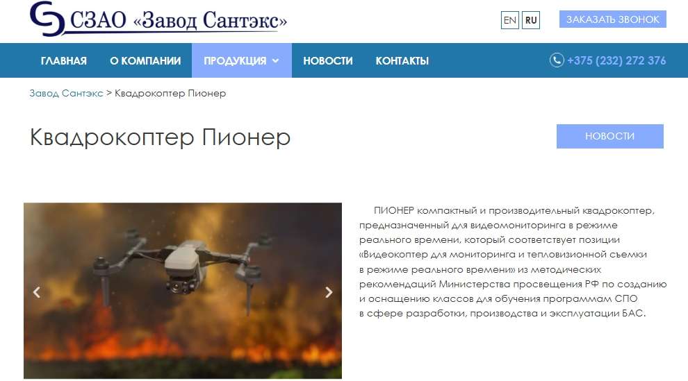 В июне 2025 года среди форм для выпечки и кастрюль гомельский завод «Сантэкс» предложил к продаже беспилотник «Пионер». Модель описывали как «компактный и продуктивный квадрокоптер, предназначенный для видеомониторинга в режиме реального времени».
