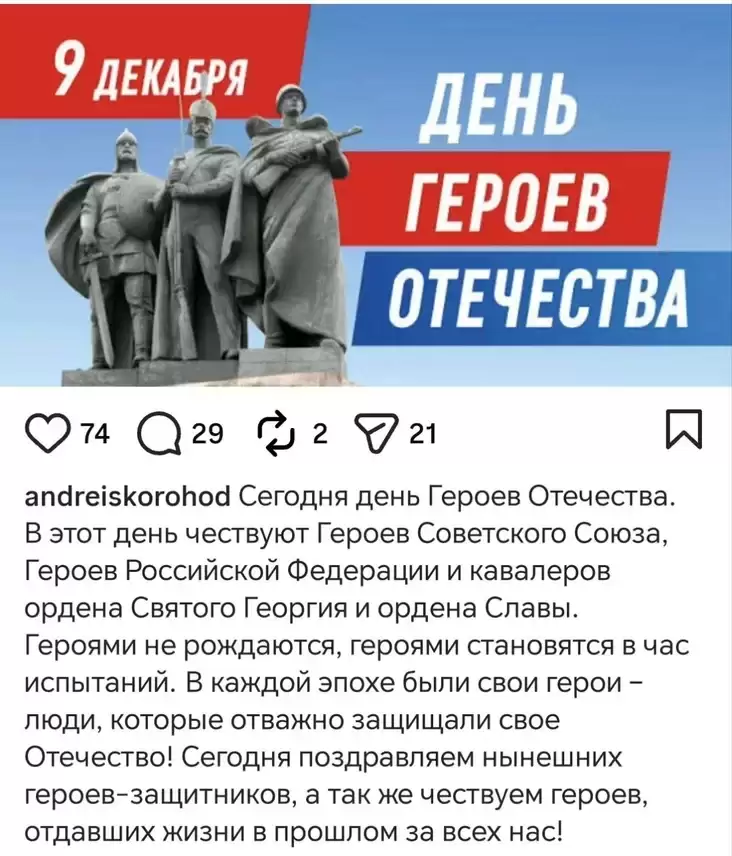 «В этот день чествуют Героев Советского Союза, Героев Российской Федерации и кавалеров ордена Святого Георгия и ордена Славы. Героями не рождаются, героями становятся во время испытаний. В каждой эпохе были свои герои — люди, мужественно защищавшие свое Отечество! Сегодня поздравляем нынешних героев-защитников, а также чествуем героев, отдавших жизнь в прошлом за всех нас!» — с пафосом написал он.