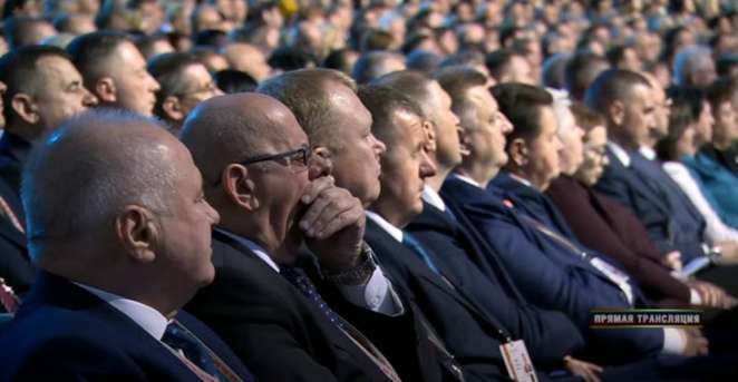 Во время трансляции государственных СМИ показывали делегатов ВНС, которые скучали, тяжело вздыхали, зевали или вытирали пот. Минск, Беларусь. 24 апреля 2024 года. Скриншот: БелТА / Youtube