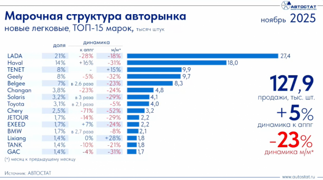 Статистика продаж легковых автомобилей в России в ноябре 2025 года. Скриншот: autostat / RUTUBE
