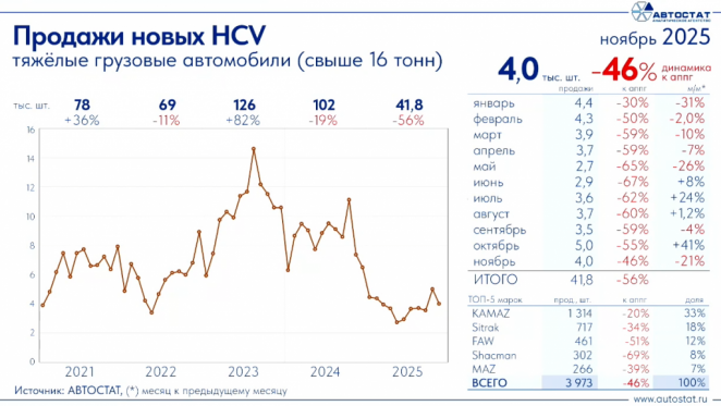 Статистика продаж грузовиков в России в ноябре 2025 года. Скриншот: autostat / RUTUBE