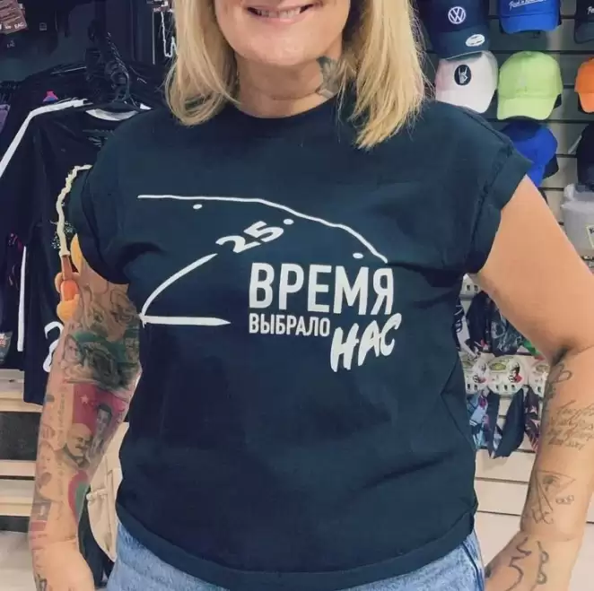 Почти на груди 50‑летней белоруски упомянут Лукашенко: «A. G. Lukashenko 30.08.1954 r.p. Commander-in-chief armed forces and national president of Republic Belarus» («А. Г. Лукашенко, 30.08.1954 г.р. Главнокомандующий вооруженными силами и национальный президент Республики Беларусь»). Рядом — красно-зеленый флаг.