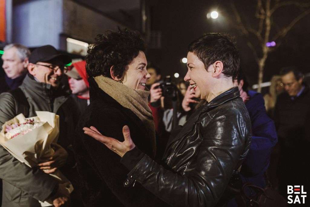 Бывший координатор штаба Виктора Бабарико и политзаключенная Мария Колесникова обнимается с сестрой Татьяной Хомич. Варшава, Польша. 18 декабря 2025 года. Фото: Рауль Дюк / Белсат