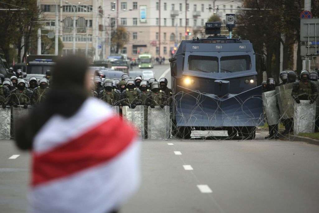 Протестующий, обернутый беларусским национальным флагом, стоит перед полицейским штурмом во время митинга против официальных результатов президентских выборов в Минске, Беларусь. 25 октября 2020 года. Фото: AP / East News