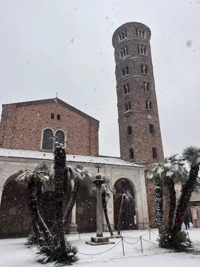 Заснеженная базилика Сант-Аполлинаре-Нуово в итальянской Равенне. Фото из соцсетей