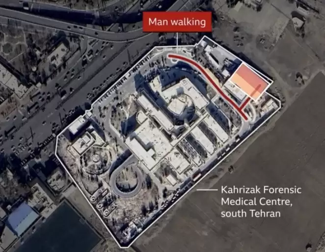 Спутниковый снимок тегеранского Центра судебной медицины и маршрут, по которому двигался по территории центра автор видео