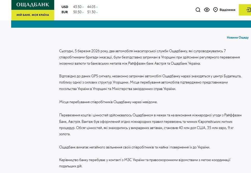 В Венгрии вчера, 5 марта, местные правоохранители задержали два инкассаторских автомобиля украинского государственного Ощадбанка и 7 сотрудников бригады инкассации, сообщила пресс-служба «Ощадбанка». Эту информацию подтвердил министр иностранных дел Украины Андрей Сибига.