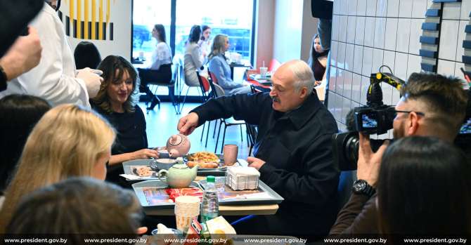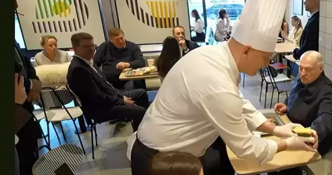 После общения с сотрудниками и посетителями фаст-фуда Лукашенко лично продегустировал меню ресторана. Он сделал заказ через киоск самообслуживания, выбрав бургер, картофель фри, кофе, десерт.