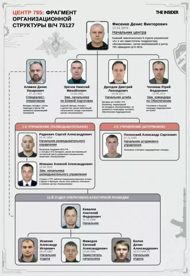 Так в декабре 2022 года по решению Генштаба РФ возник Центр 795 (в/ч 75127). Эта сверхсекретная и автономная структура задумывалась как более закрытая альтернатива группам ГРУ для выполнения наиболее ответственных задач, в том числе политических убийств и похищений, но без системных ошибок и «засвеченных» кадров прошлого.