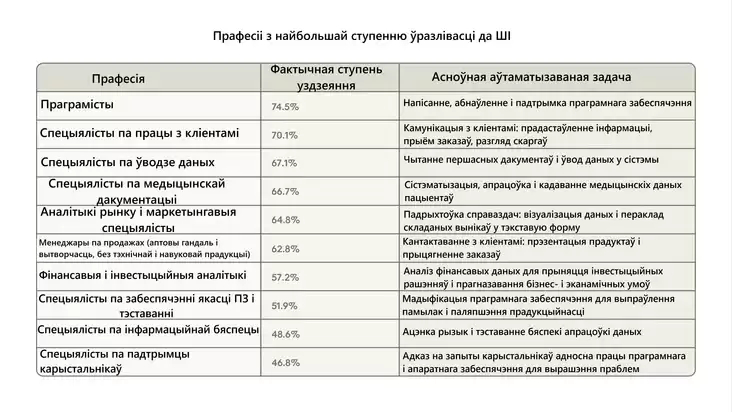 Данные показывают, что ИИ еще далек от достижения своих максимальных возможностей. Например, в таких сферах, как ИТ, бизнес, финансы и администрирование, ИИ теоретически может ускорить выполнение 90—96% задач. Однако на практике в тех же ИТ-специальностях реальный охват составляет пока только 33%.