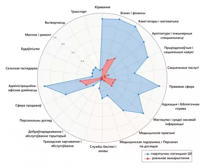Исследование выявляет существенный разрыв между теоретическим потенциалом ИИ и его реальным применением. На соответствующей диаграмме представлены два показателя (соответственно, синий и красный цвета): теоретический потенциал ИИ (какую часть задач в профессии ИИ в принципе может выполнять) и реальное использование сегодня.