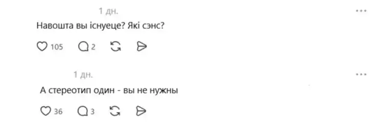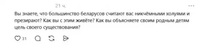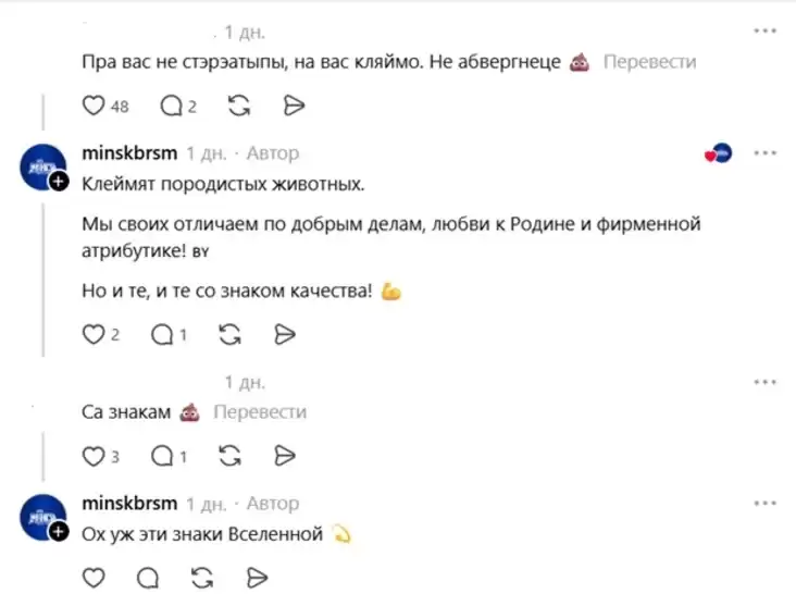 Такие ответы вызвали еще большее возмущение: «Вы знаете, что большинство белорусов считают вас никчемными холуями и презирают? Как вы с этим живёте? Как вы объясняете своим родным детям цель своего существования?» — спрашивает один из пользователей.