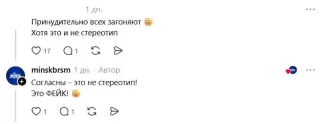 На замечание: «Принудительно всех загоняют. Хоть это и не стереотип», редакторы канала ответили: «Согласны — это не стереотип! Это ФЕЙК!».