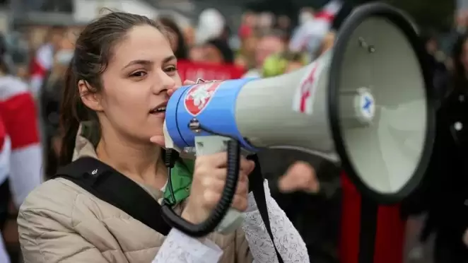 Полина Зыль на Женском марше. За участие в протестах она попала на сутки в сентябре 2020 года, а потом еще и получила уголовное дело. Фото: funkemedien.de