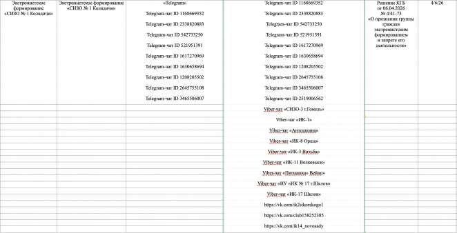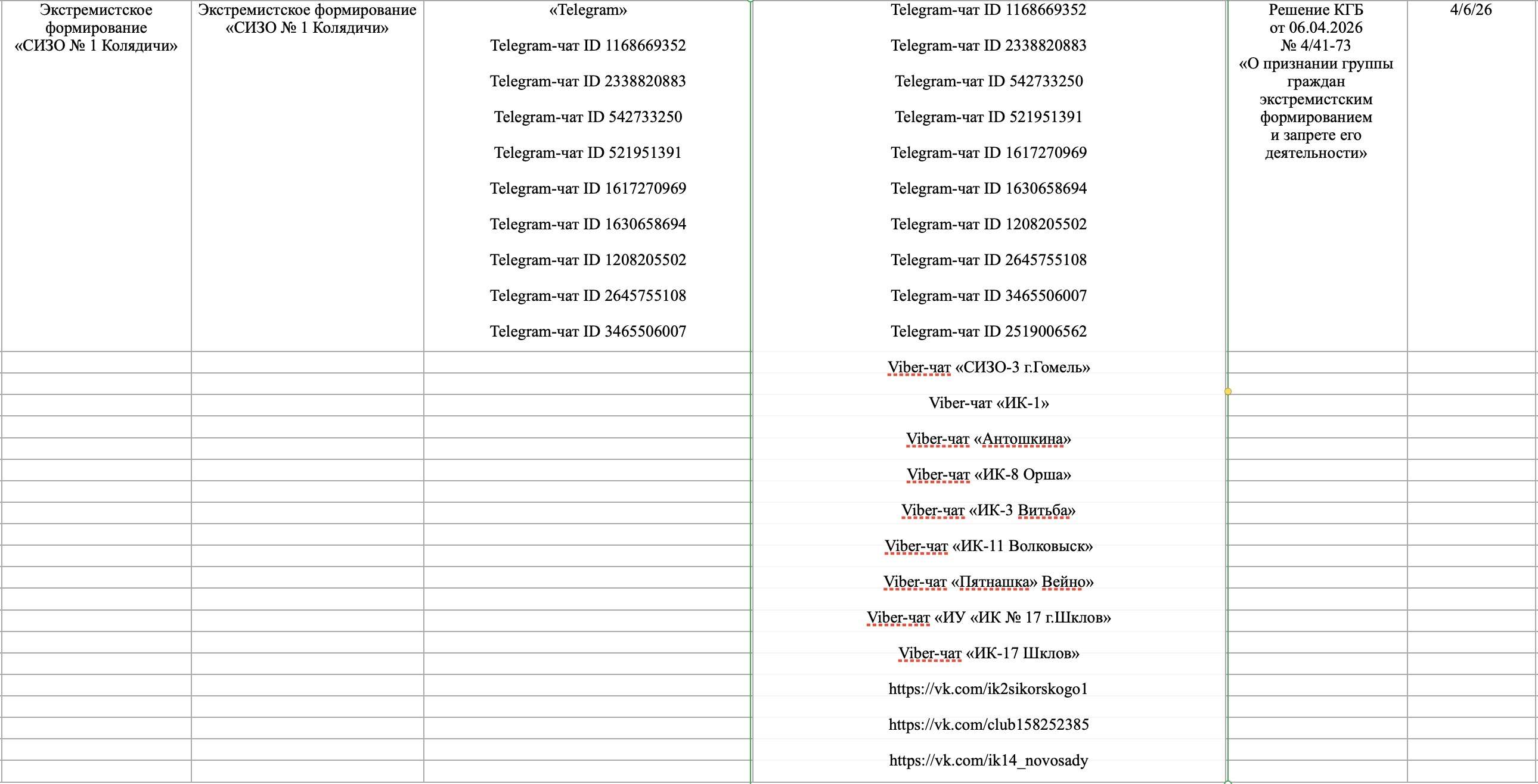 6 апреля 2026 года КГБ принял решение о признании экстремистским формированием чата «СИЗО №1 Колядичи». Это уже несуществующий чат родственников арестантов, в котором обсуждались вопросы о том, что можно класть в передачу, а что нельзя, как правильно отправлять посылки и по какому графику работает СИЗО. В пиковый момент в нем было около 1900 человек, но после того, как чат признали «экстремистскими материалами», администраторы удалили его.