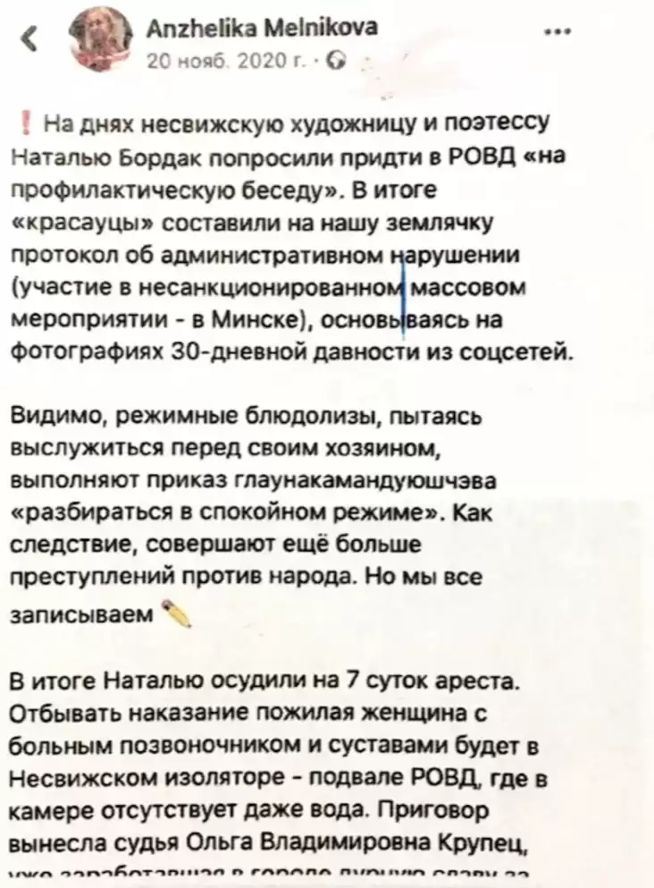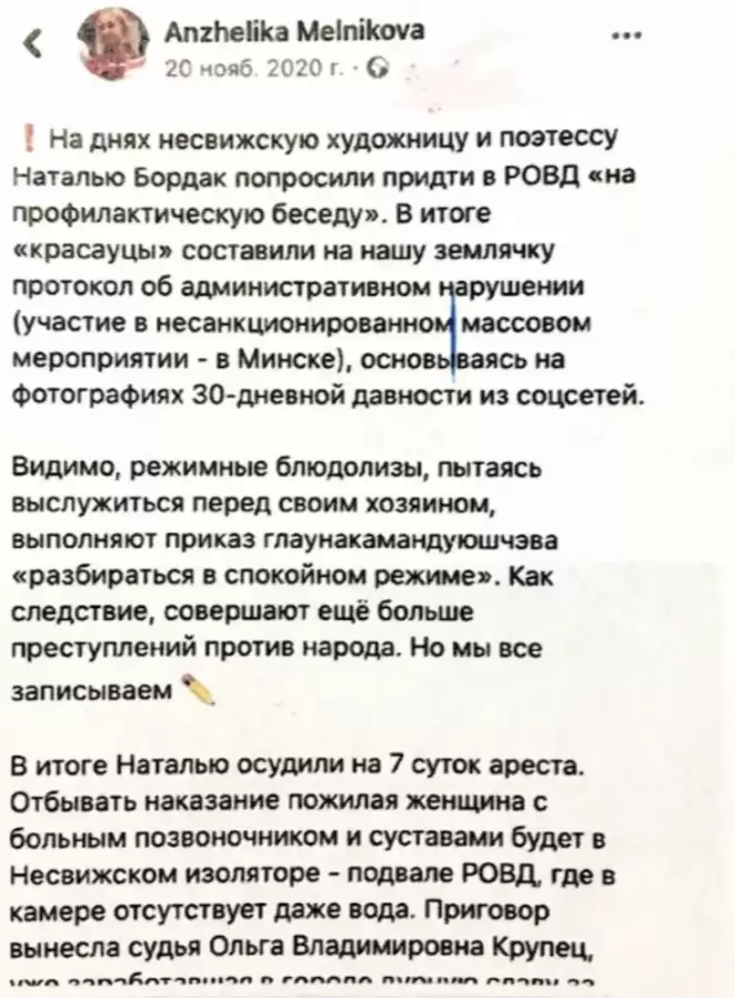 Художница, поэтесса и общественная деятельница из Несвижа Наталья Бордак, которую многие знают под псевдонимом Наталка Хвоя, рассказала «Салідарнасці» о бывшем спикере Координационного совета Анжелике Мельниковой, которая сначала таинственно исчезла из Польши, а потом, похоже, оказалась в Беларуси.