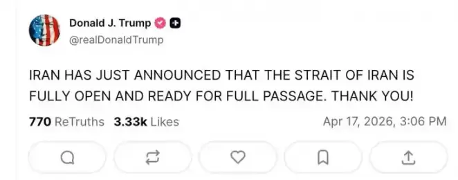 «Иран только что объявил, что пролив Ирана полностью открыт и готов к свободному проходу. Спасибо!»