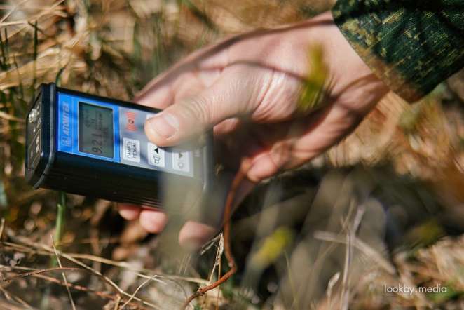 Человек держит дозиметр в зоне отчуждения в Полесском государственном радиационно-экологическом заповеднике. Снимок носит иллюстративный характер. Фото: lookby.media