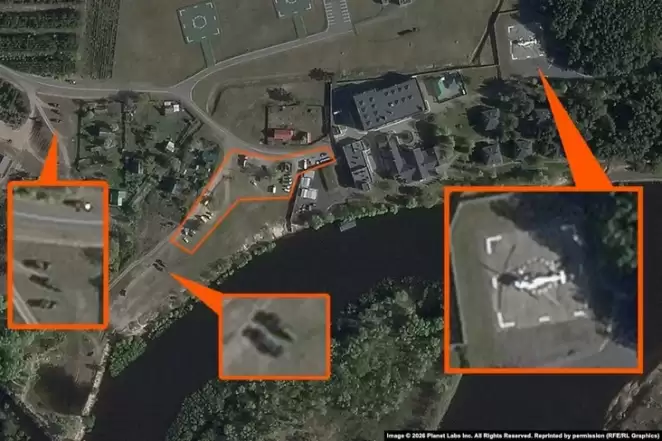 На снимке виден вертолет белого цвета, который стоит на вертолетной площадке внутри территории резиденции и около 20 гражданских автомобилей разного назначения рядом с одним из въездов в нее. Также на снимке можно заметить 6 машин, которые могут принадлежать военным. Все они цвета хаки и стоят отдельно от остальных. Точный тип техники определить невозможно из-за качества полученного спутникового снимка, но по крайней мере три из них похожи на военные грузовики.