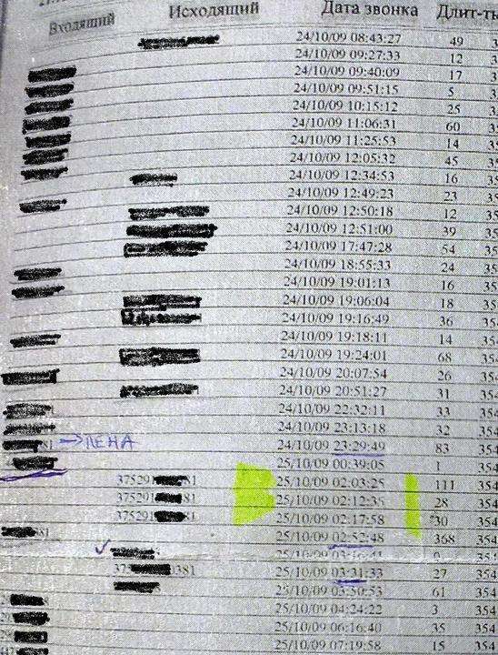 Распечатка разговоров Ивана Т. в ночь с 24 на 25 октября 2009 года. Желтым отмечены его исходящие звонки жене в то время, когда, по его заявлениям в суде, он «лег спать»