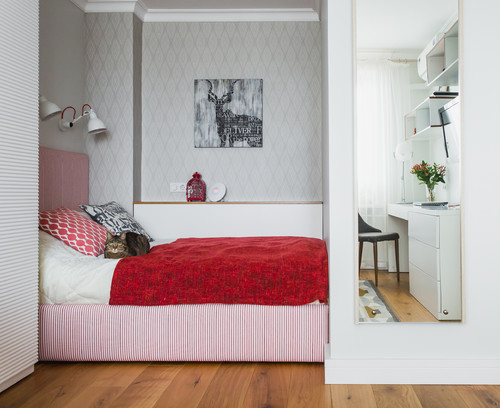 Иногда в планировках однушек есть ниши, в которых мы привыкли устраивать кладовки или гардеробные. В такой альков удобно встроить кровать, оставив больше места для гостиной или столовой.
