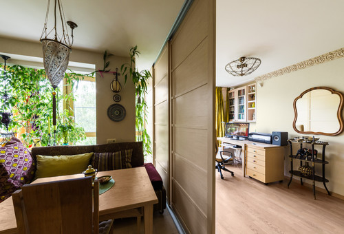 Промежуточный вариант между шкафом и занавесками — мобильная деревянная перегородка с раздвижными дверями. Такая перегородка не требует согласования и позволяет при необходимости поделить комнату на приватные зоны. При этом сохраняется открытая планировка комнаты, которая делает квартиру визуально более просторной.