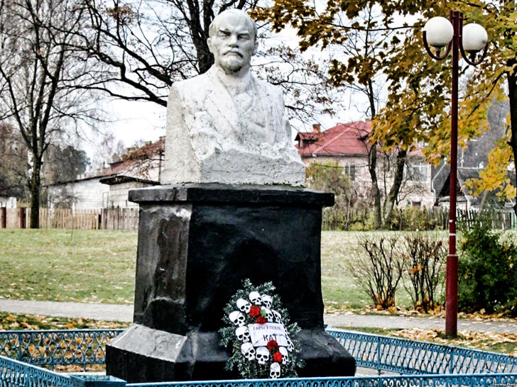 Еще более «стратегически недальновидно» столетие октябрьского гвалта отметили в поселке Березовка Лидского района - там местные активисты возложили к подножию памятника Ленину венок, украшенный черепами и колючей проволокой. «Гори в аду, палач», - гласила прикрепленная к венку бумажка (на фото). Как пояснил в комментарии «Радыё Свабода» один из участников возложения Витольд Ашурак, сделали они это, «чтобы напомнить о тех миллионах людей, которых большевики убили». Но актуальный венок пролежал недолго - не прошло и получаса, как его убрали некие бдительные товарищи.